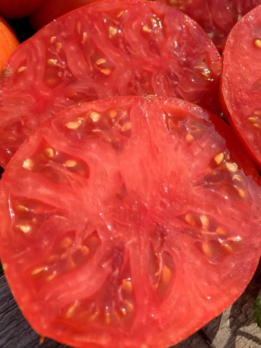 Мякоть обладает исключительной мясистостью и высокой плотностью, при этом оставаясь очень сочной. На изломе явно видна ее сахаристая, почти зернистая структура, характерная для старых биф-томатов. Семенных камер мало, они небольшие по размеру, что увеличивает долю полезной мякоти.