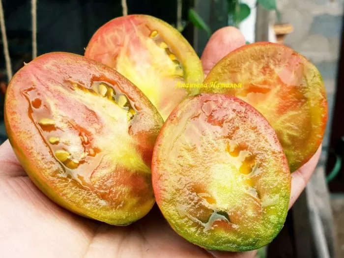 Мякоть сочная, мясистая. Вкус, как отмечено в характеристиках, отличается выраженной сладостью с приятными фруктовыми нотками, что делает эти томаты особенно ценными для свежего потребления.