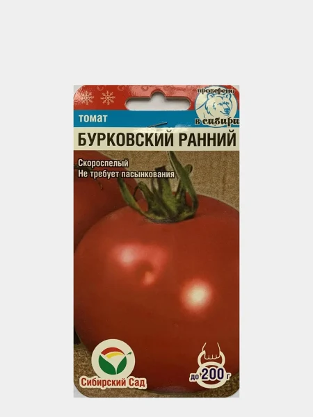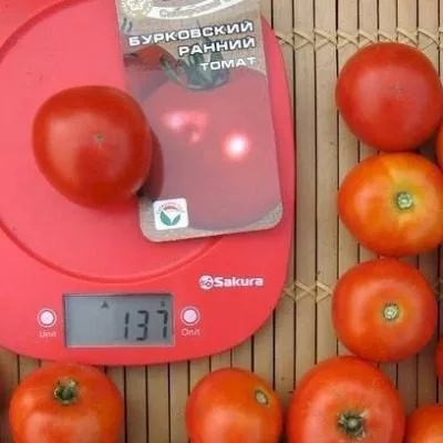 Главная отличительная черта Бурковского раннего — удачное сочетание свойств, которые редко встречаются вместе у раннеспелых томатов. Низкорослый, компактный куст высотой 50-60 см сочетается с крупными плодами массой 150-200 граммов. Обычно ранние сорта для ускорения отдачи бывают мелкоплодными, а крупноплодность чаще ассоциируется с высокорослыми индетерминантными формами с длительным периодом вегетации.