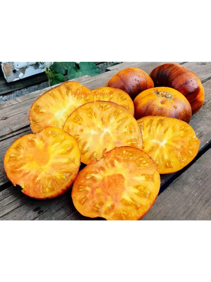 Форма плода округлая, часто слегка приплюснутая у плодоножки. Мякоть плотная, мясистая (биф-тип), с небольшим количеством семян и насыщенным медовым вкусом. Внутренний цвет мякоти — оранжево-красный, без фиолетовых оттенков, которые присутствуют только в кожице.