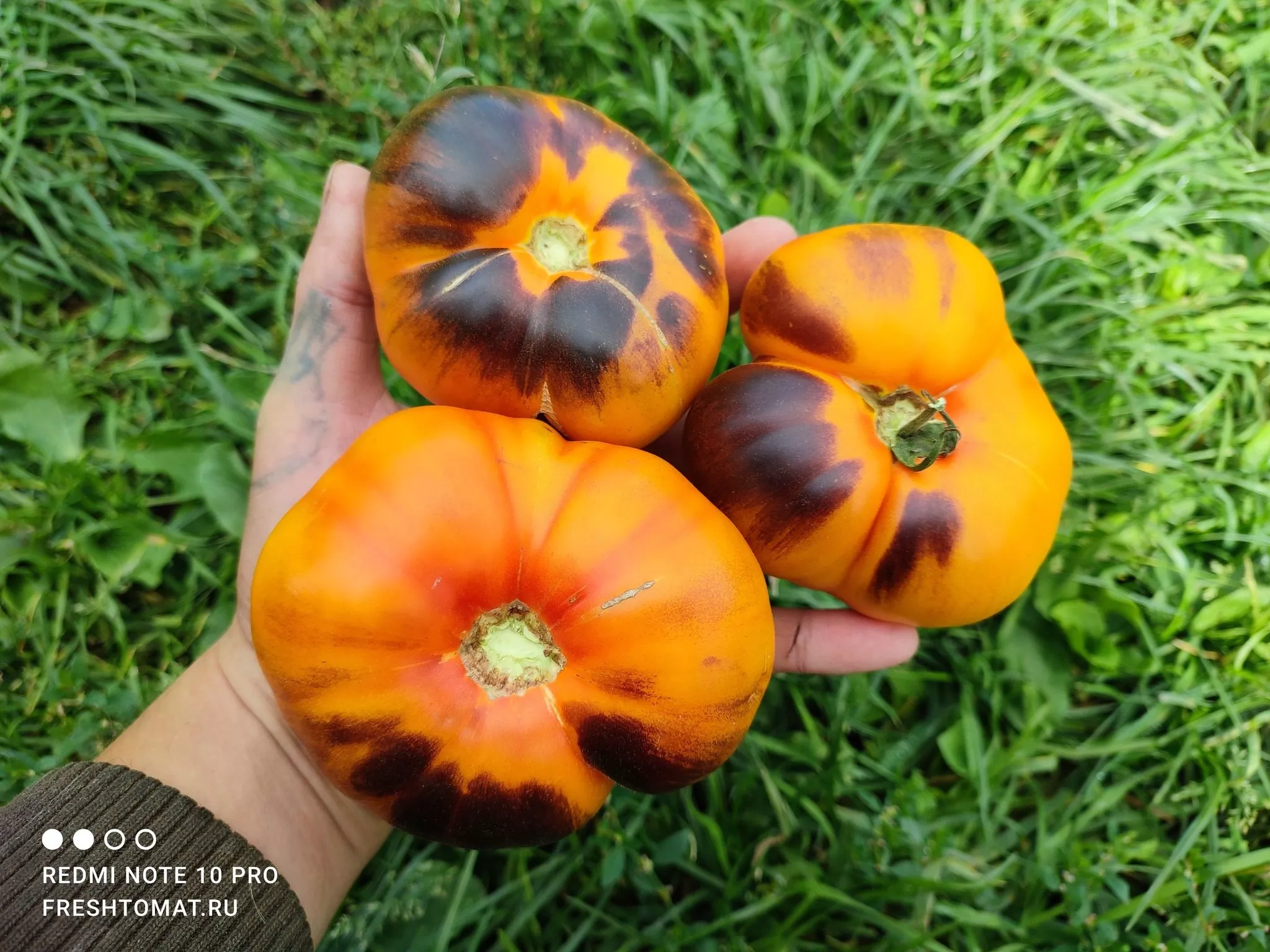 Главной отличительной чертой сорта является уникальная окраска зрелых плодов. Она классифицируется как биколорная (двухцветная), но с нюансом. Основной фон — насыщенный оранжевый, а на его поверхности проявляются темно-синие, почти чернильные разводы и плечики. Такой эффект создается благодаря сочетанию двух типов пигментов: каротиноидов (оранжевый цвет) и антоцианов (фиолетовый оттенок).