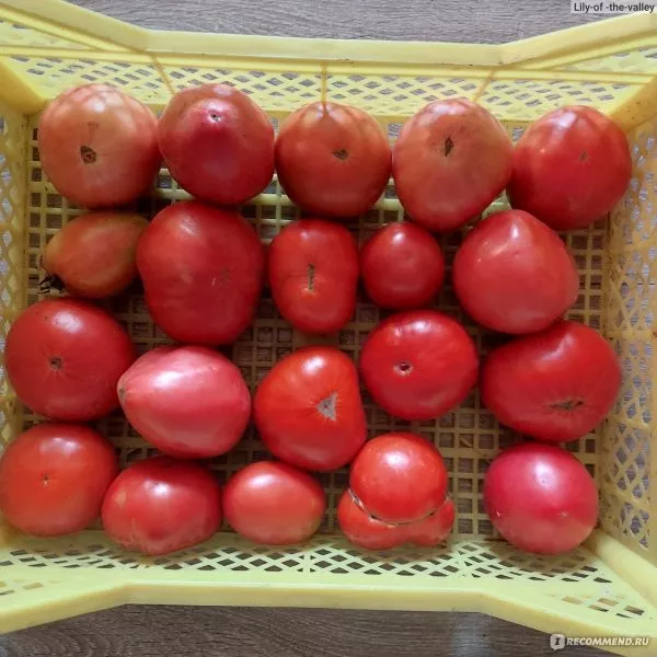 По мере роста растения вверх плоды на верхних кистях закономерно мельчают, их вес составляет 200-400 граммов. Однако даже уменьшенные в размере, они полностью сохраняют узнаваемую сердцевидную форму и сортовые вкусовые качества.