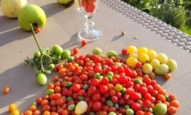 Плоды отличаются выравненностью и идеальной округлой формой. Их небольшой размер, 20-25 граммов, соответствует стандартам коктейльных томатов. В состоянии технической спелости они приобретают равномерный ярко-красный цвет без зеленого пятна у плодоножки.