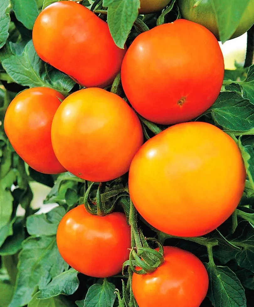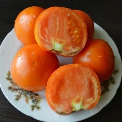 Плоды имеют характерную плоскоокруглую форму, часто с заметной ребристостью в области плодоножки. Эта ребристость особенно выражена у самых крупных томатов первой кисти. В биологической спелости плоды приобретают яркий оранжево-красный окрас — насыщенный и равномерный.