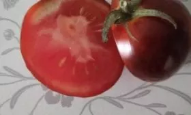 Мякоть обладает плотной, мясистой структурой (что характерно для плодов массой 150-180 граммов) и выраженным ароматом. Ключевой особенностью является влияние антоцианов — природных пигментов, ответственных за темно-бордовую с фиолетовым оттенком окраску. Эти вещества не только окрашивают кожуру и часть мякоти у плодоножки («плечики»), но и могут придавать вкусу едва уловимую, пикантную пряную ноту. Многие дегустаторы описывают ее как легкий сливовый или ягодный оттенок, что делает вкус более сложным и интересным по сравнению с традиционными красными томатами.