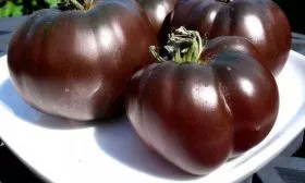 Плоды «Черных глаз» — типичные биф-томаты: крупные, мясистые, многокамерные. Их средняя масса составляет около 280 граммов, а форма — плоскоокруглая с выраженной средней ребристостью у плодоножки. Главная отличительная черта — уникальный фиолетово-коричневый цвет зрелого плода.