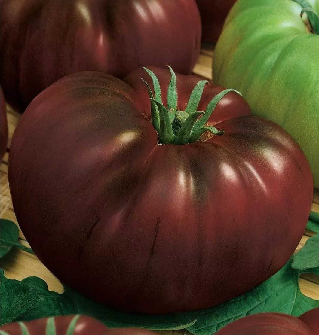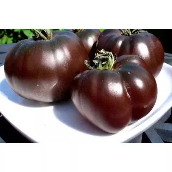 Плоды «Черных глаз» — типичные биф-томаты: крупные, мясистые, многокамерные. Их средняя масса составляет около 280 граммов, а форма — плоскоокруглая с выраженной средней ребристостью у плодоножки. Главная отличительная черта — уникальный фиолетово-коричневый цвет зрелого плода.