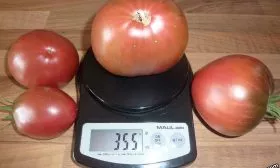 Средняя масса соответствует заявленным характеристикам и составляет 400-500 граммов. На первых кистях плоды нередко набирают и больший вес. Окраска в технической спелости неравномерная: у плодоножки сохраняется темно-зеленое пятно, остальная часть начинает розоветь.