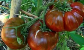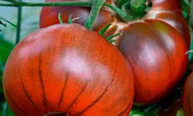 Окраска зрелого плода указана как черно-коричневая. На практике она может варьироваться в зависимости от освещенности и стадии зрелости, приобретая глубокие шоколадные, фиолетово-бурые или темно-бордовые оттенки. Характерной особенностью является неравномерность окрашивания: основание (плечики) часто остается более светлым, зеленовато-коричневым, что не является недостатком, а лишь подтверждает принадлежность к биколорным сортам.