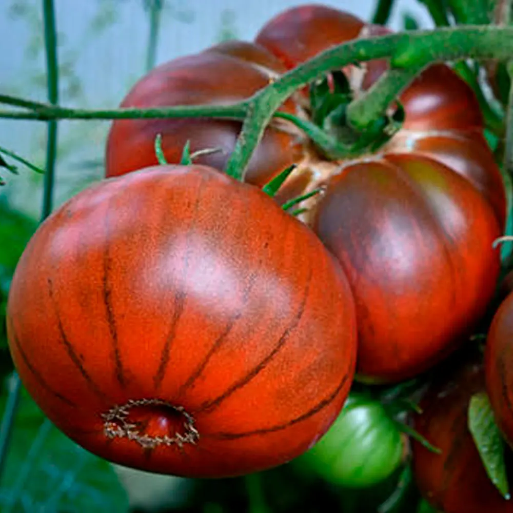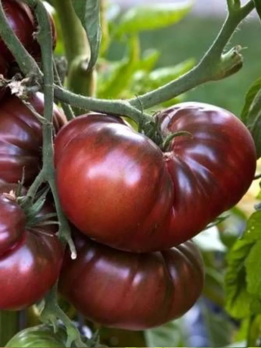 Окраска зрелого плода указана как черно-коричневая. На практике она может варьироваться в зависимости от освещенности и стадии зрелости, приобретая глубокие шоколадные, фиолетово-бурые или темно-бордовые оттенки. Характерной особенностью является неравномерность окрашивания: основание (плечики) часто остается более светлым, зеленовато-коричневым, что не является недостатком, а лишь подтверждает принадлежность к биколорным сортам.