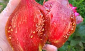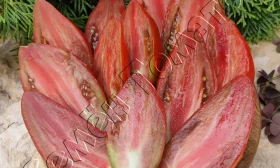 Мякоть плодов действительно мясистая и сахаристая на изломе, с минимальным количеством семенных камер и пустот. Высокий процент сухих веществ делает эти томаты исключительно удобными для кулинарной переработки, что полностью соответствует заявленному назначению сорта.