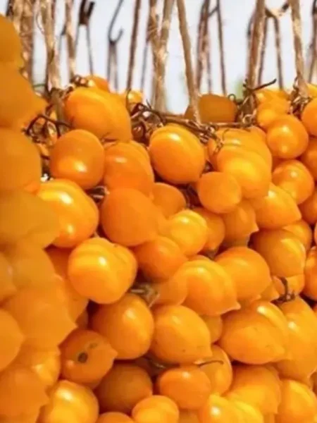 В стадии полной зрелости томаты приобретают чистый, насыщенный ярко-желтый цвет без какого-либо зеленого пятна у плодоножки. Кожица гладкая и плотная, что является важным качеством для сорта, предназначенного для вяления и консервации. Масса каждого плода составляет 40-60 граммов, что для категории черри считается довольно крупным размером.