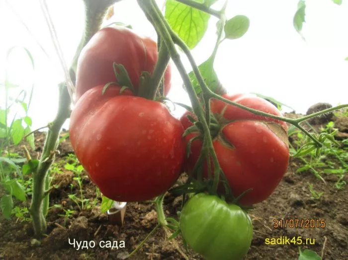 Лист у сорта Чудо сада крупный, типичный для томата, темно-зеленого цвета. Сильная облиственность требует внимания: она создает благоприятный микроклимат для развития болезней в нижнем ярусе и может затенять формирующиеся плодовые кисти. Поэтому при уходе, наряду с удалением пасынков (боковых побегов в пазухах листьев), часто практикуют частичное прореживание листьев, особенно ниже уже наливающейся кисти.