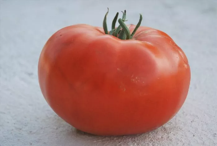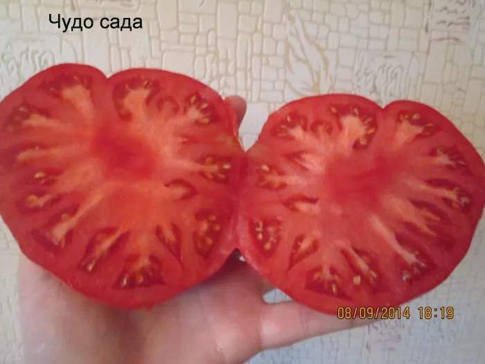 Насыщенный красный цвет равномерно распределяется по всей поверхности при полном созревании. Мякоть обладает исключительной плотностью и мясистостью, так называемой «бифштексной» структурой: на срезе она сахаристая, с минимальным количеством семенных камер и сока. Именно эта особенность — высокое содержание сухих веществ — определяет превосходные вкусовые качества и основное кулинарное назначение.