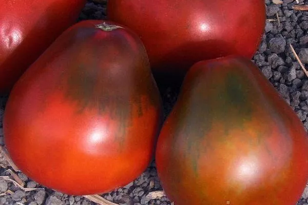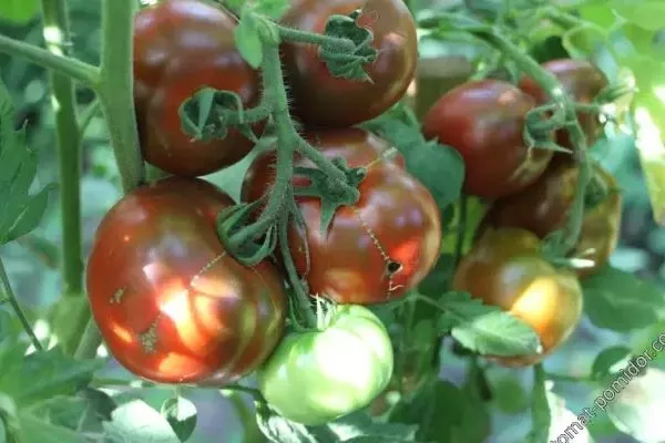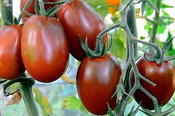 Полностью спелые плоды имеют форму яйца, могут весить от 40 до 50 г. Кожица помидоров плотная, гладкая, с блеском, коричневого цвета с оттенком малинового и отличается характерным тёмным пятном у основания.