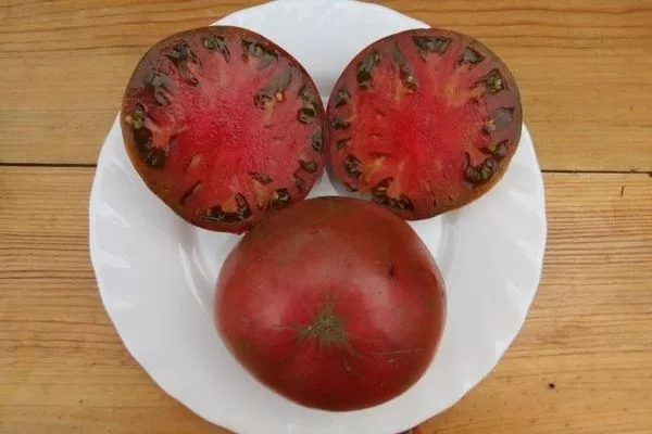 Выделяется крупноплодностью – средний вес помидора составляет 100-150 г, но иногда встречаются экземпляры весом до 300-400 г. Плоды обладают коричневым цветом с фиолетовым оттенком и глянцевой кожицей.