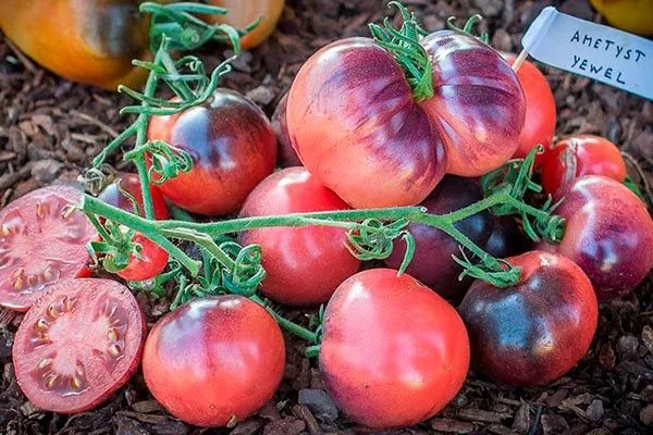 - Аметистовая драгоценность. Помидор среднего срока созревания – достигает спелости через 3,5 месяца после посева. Кусты имеют средний рост, достигая в высоту 180 см, отличаются сильной разветвлённостью умеренной листвой.