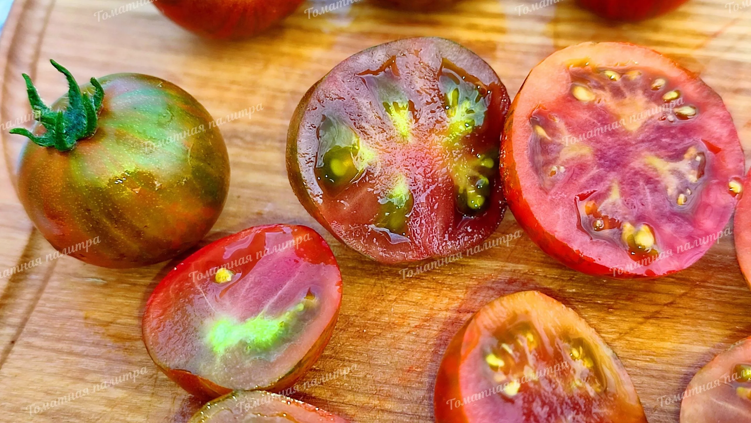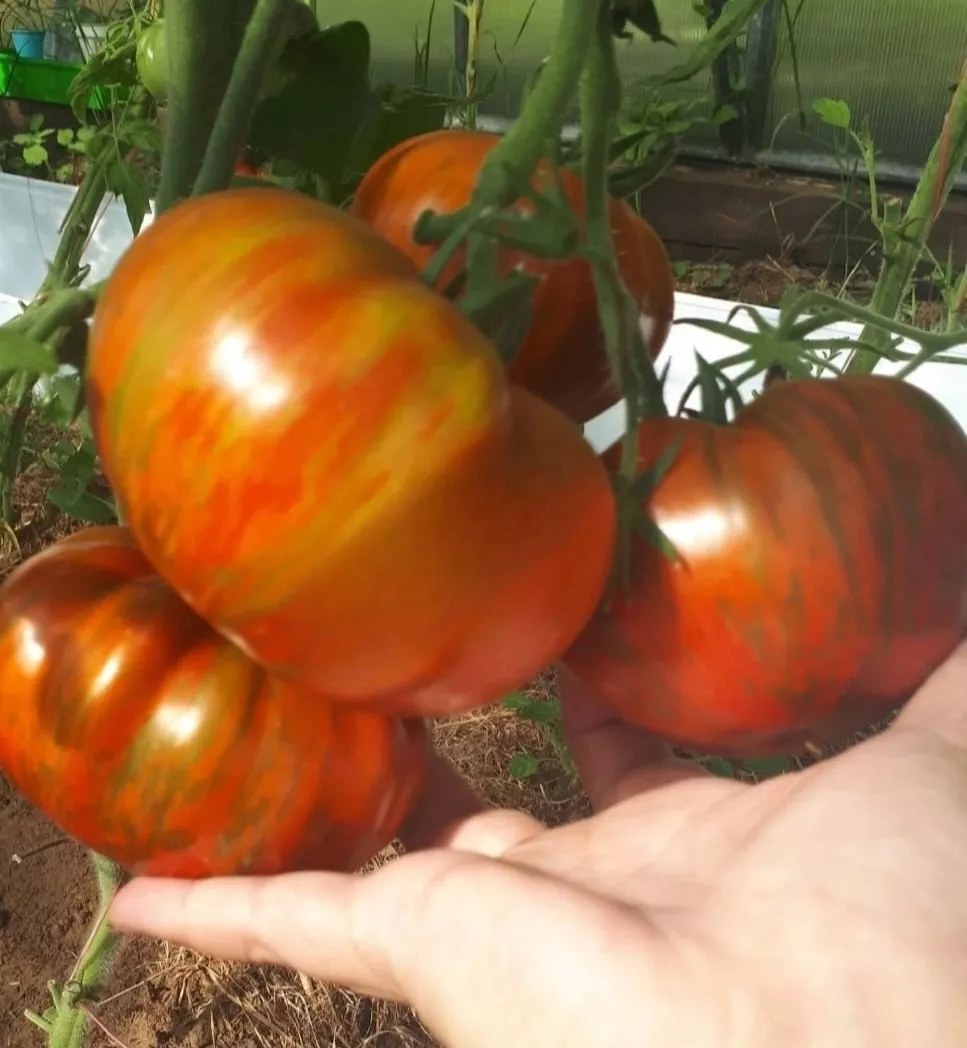 Внешний вид плодов — вторая яркая особенность. Кирпично-красная кожица с контрастными темно-зелеными, почти черными полосами создает «тигровый» эффект. Округлая форма с небольшим носиком добавляет плодам характерную узнаваемость.