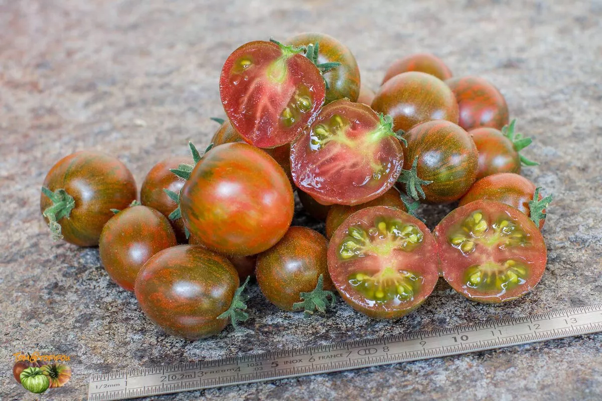 Плоды имеют округлую форму с обязательным небольшим носиком на вершине — это стабильный сортовой признак. Их масса, согласно характеристикам, колеблется от 15 до 35 граммов. Такие миниатюрные помидорки формируются в многочисленных кистях, часто сложного типа, что создает впечатление гирлянды из разноцветных фонариков. Плотность расположения плодов в кисти высокая, что в сочетании с пестрой окраской дает максимальный декоративный эффект.