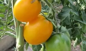 В технической спелости плоды светло-зеленые, без темного пятна у плодоножки, что является сортовым признаком. Полностью созревший томат приобретает насыщенный солнечно-желтый, почти янтарный цвет.
