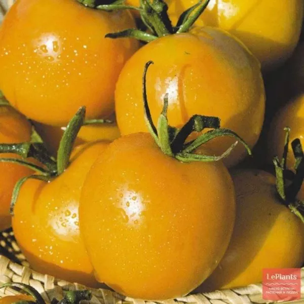 В технической спелости плоды светло-зеленые, без темного пятна у плодоножки, что является сортовым признаком. Полностью созревший томат приобретает насыщенный солнечно-желтый, почти янтарный цвет.
