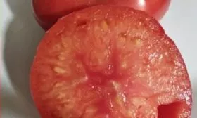 Мякоть очень плотная, многокамерная и исключительно мясистая, с так называемым сахаристым изломом. Семенных камер и самих семян внутри немного. Кожица имеет среднюю плотность: она надежно защищает плод от растрескивания при грамотном поливе и обеспечивает достаточную для крупноплодного томата транспортабельность, не создавая ощущения жесткости.