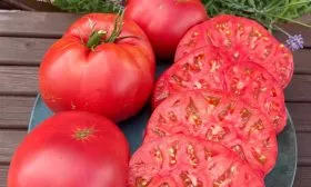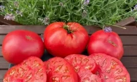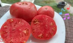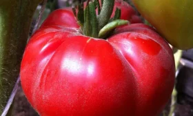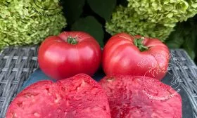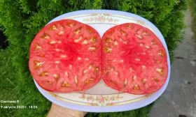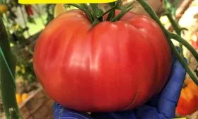Окраска зрелых томатов – насыщенная малиново-розовая. Мякоть очень плотная, мясистая, с малым количеством семян и так называемым «сахарным» изломом. Вкус классический, гармоничный, с балансом сладости и легкой кислоты, что характерно для многих крупноплодных сортов. Кожица средней плотности, что оптимально для таких размеров: она предохраняет от растрескивания, но не ухудшает потребительских качеств.
