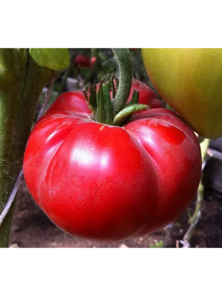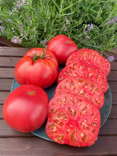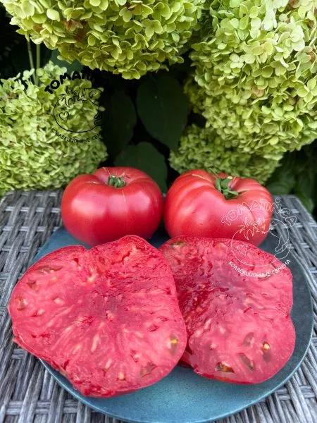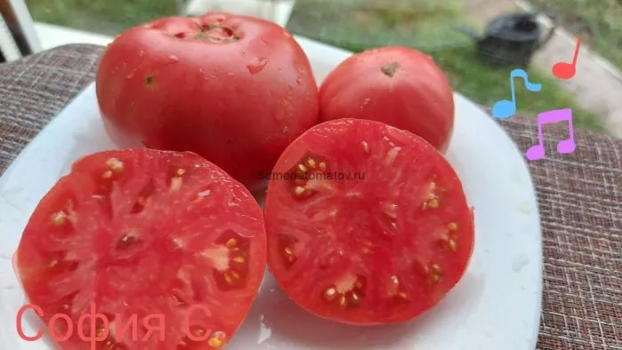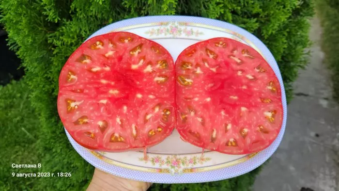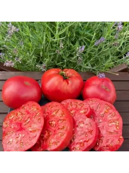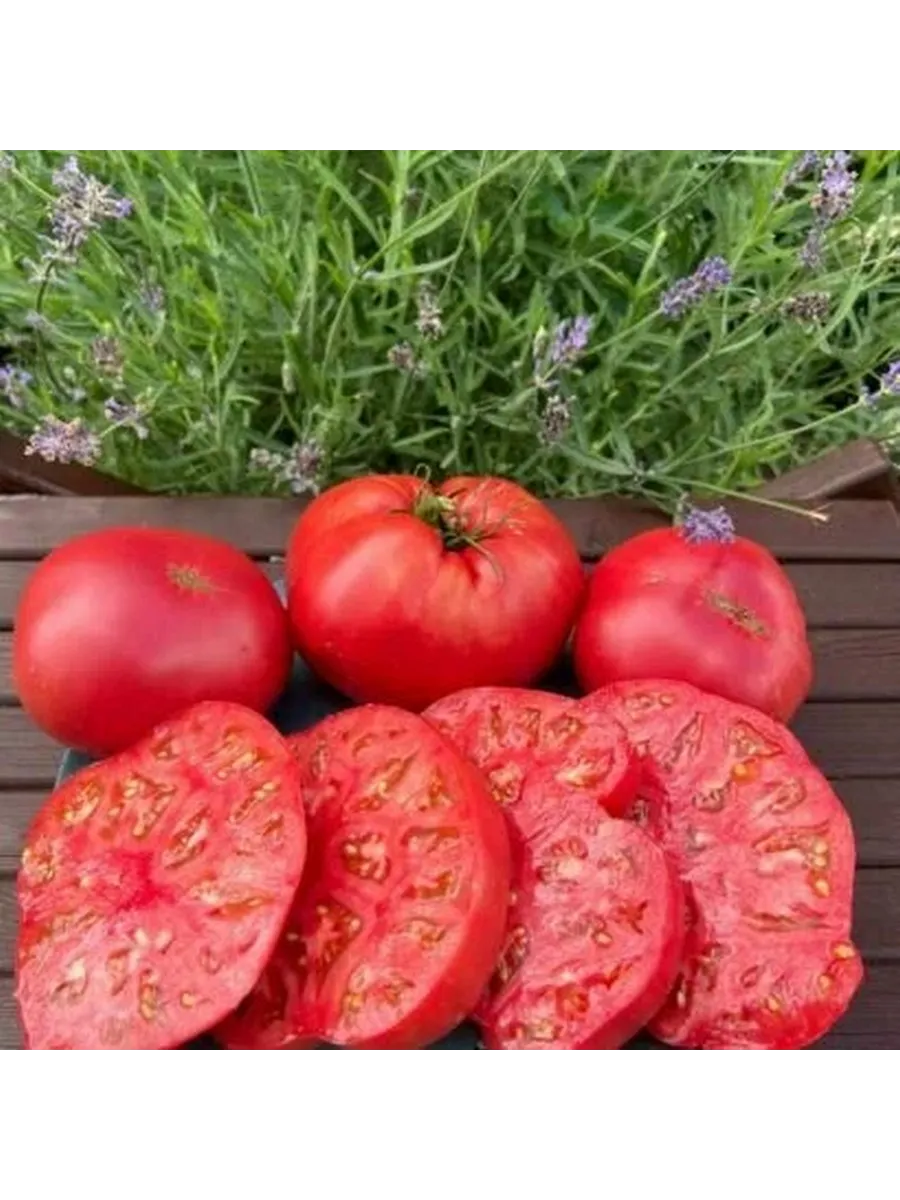 Окраска зрелых томатов – насыщенная малиново-розовая. Мякоть очень плотная, мясистая, с малым количеством семян и так называемым «сахарным» изломом. Вкус классический, гармоничный, с балансом сладости и легкой кислоты, что характерно для многих крупноплодных сортов. Кожица средней плотности, что оптимально для таких размеров: она предохраняет от растрескивания, но не ухудшает потребительских качеств.