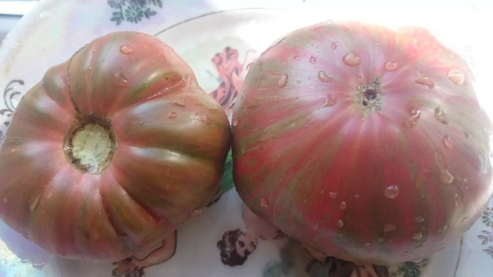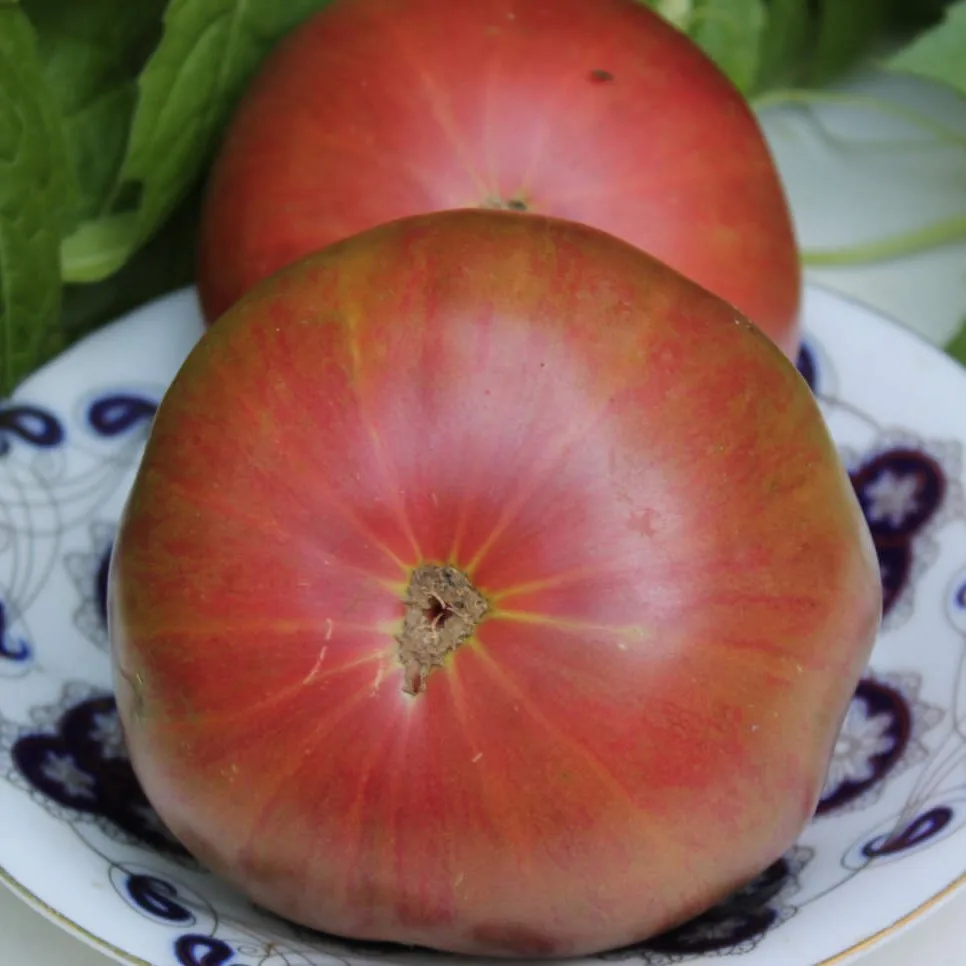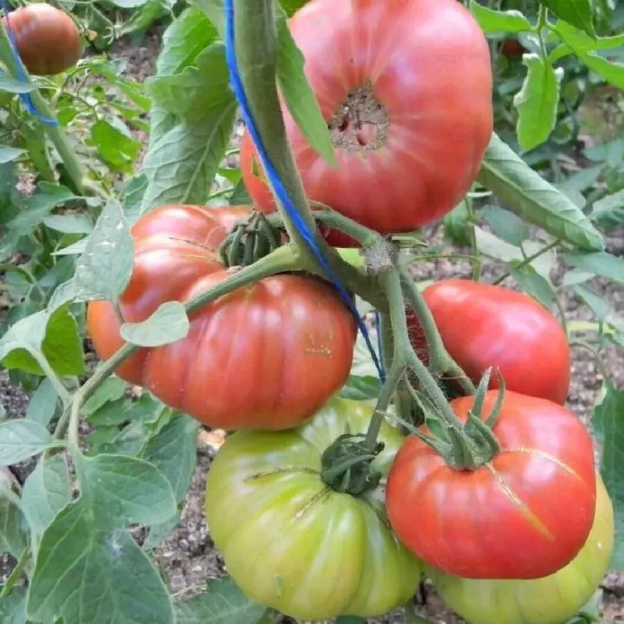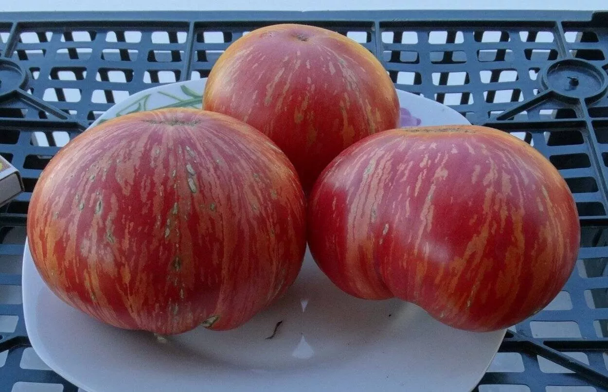 Форма плодов плоскоокруглая, часто с выраженной ребристостью в области плодоножки, что типично для крупноплодных томатов. Размер и масса плодов на одном кусте могут значительно варьироваться, от 300 до 500 граммов, причем первые завязи на нижних кистях нередко бывают самыми крупными.