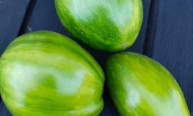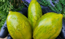 Плоды имеют стабильную, узнаваемую форму – продолговато-сливовидную с острым «носиком», что характерно для некоторых биколорных сортов. Главная декоративная особенность – их окраска. В фазе технической спелости они светло-зеленые, а по мере созревания проявляется контрастный рисунок из темно-зеленых полосок и штрихов.