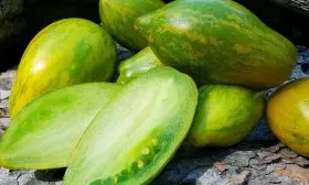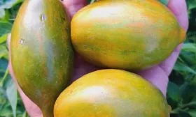 Форма плода также характерна: продолговато-сливовидная с четко выраженным острым «носиком». Такая форма не только красива, но и практична – плоды плотные, с малым количеством семян и мясистой мякотью, что делает их идеальными для цельноплодного консервирования и вяления.