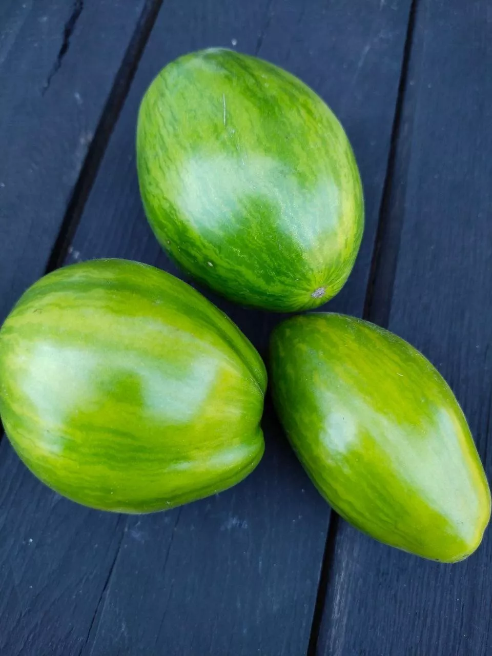 Плоды имеют стабильную, узнаваемую форму – продолговато-сливовидную с острым «носиком», что характерно для некоторых биколорных сортов. Главная декоративная особенность – их окраска. В фазе технической спелости они светло-зеленые, а по мере созревания проявляется контрастный рисунок из темно-зеленых полосок и штрихов.