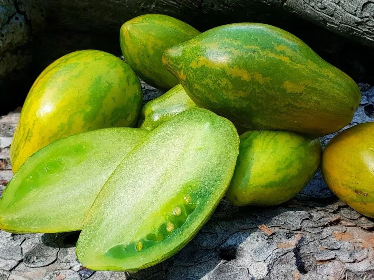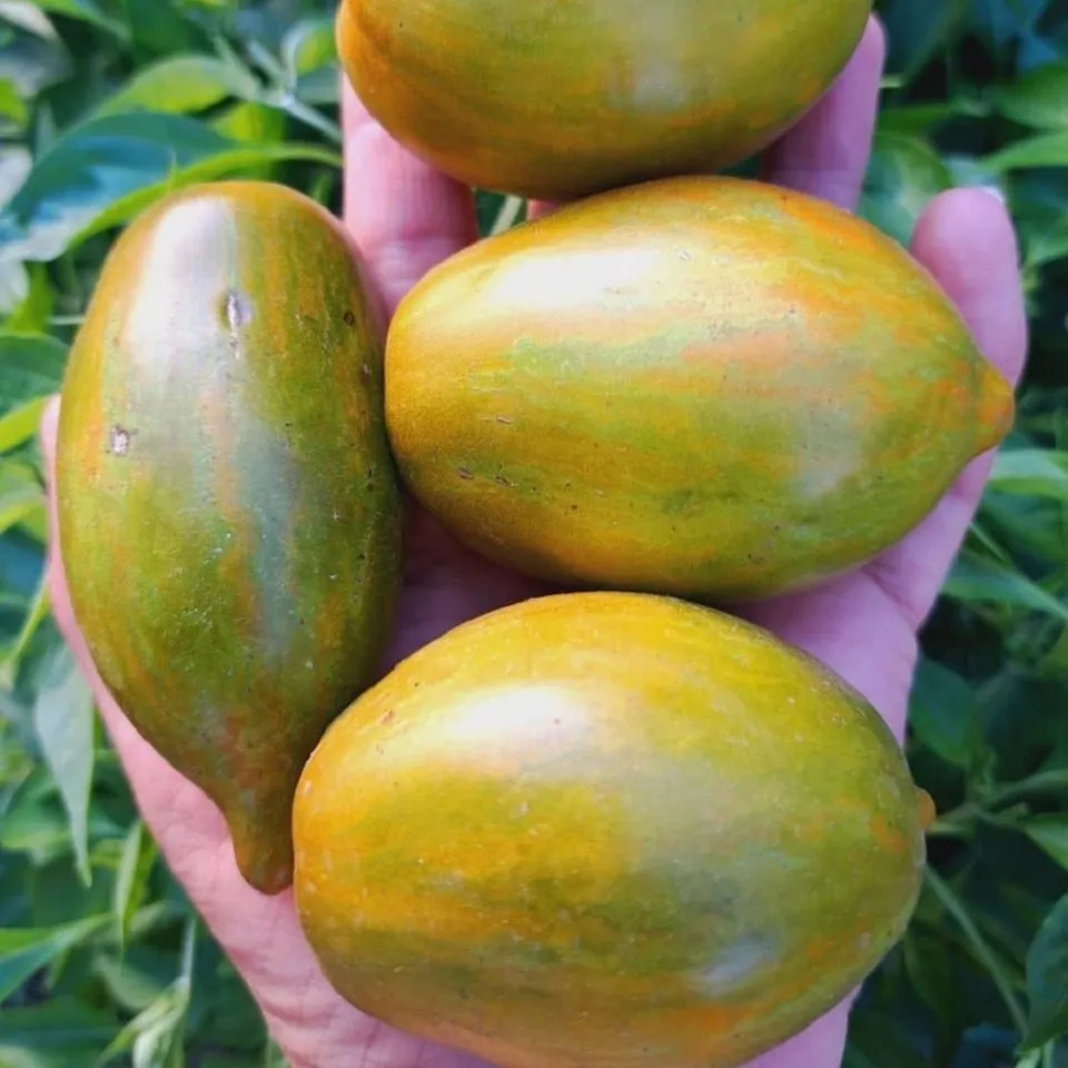 Форма плода также характерна: продолговато-сливовидная с четко выраженным острым «носиком». Такая форма не только красива, но и практична – плоды плотные, с малым количеством семян и мясистой мякотью, что делает их идеальными для цельноплодного консервирования и вяления.