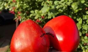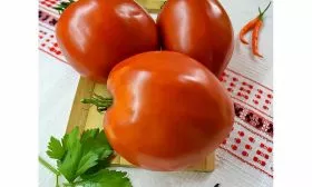 Окрашивание происходит равномерно, без зеленого пятна у плодоножки в стадии полной зрелости. Цвет кожицы и мякоти — насыщенно-красный. Плоды отличаются выдающейся массой: стандартный вес составляет 350-500 граммов, но на нижних кистях нередко завязываются гиганты массой 800-1000 граммов.