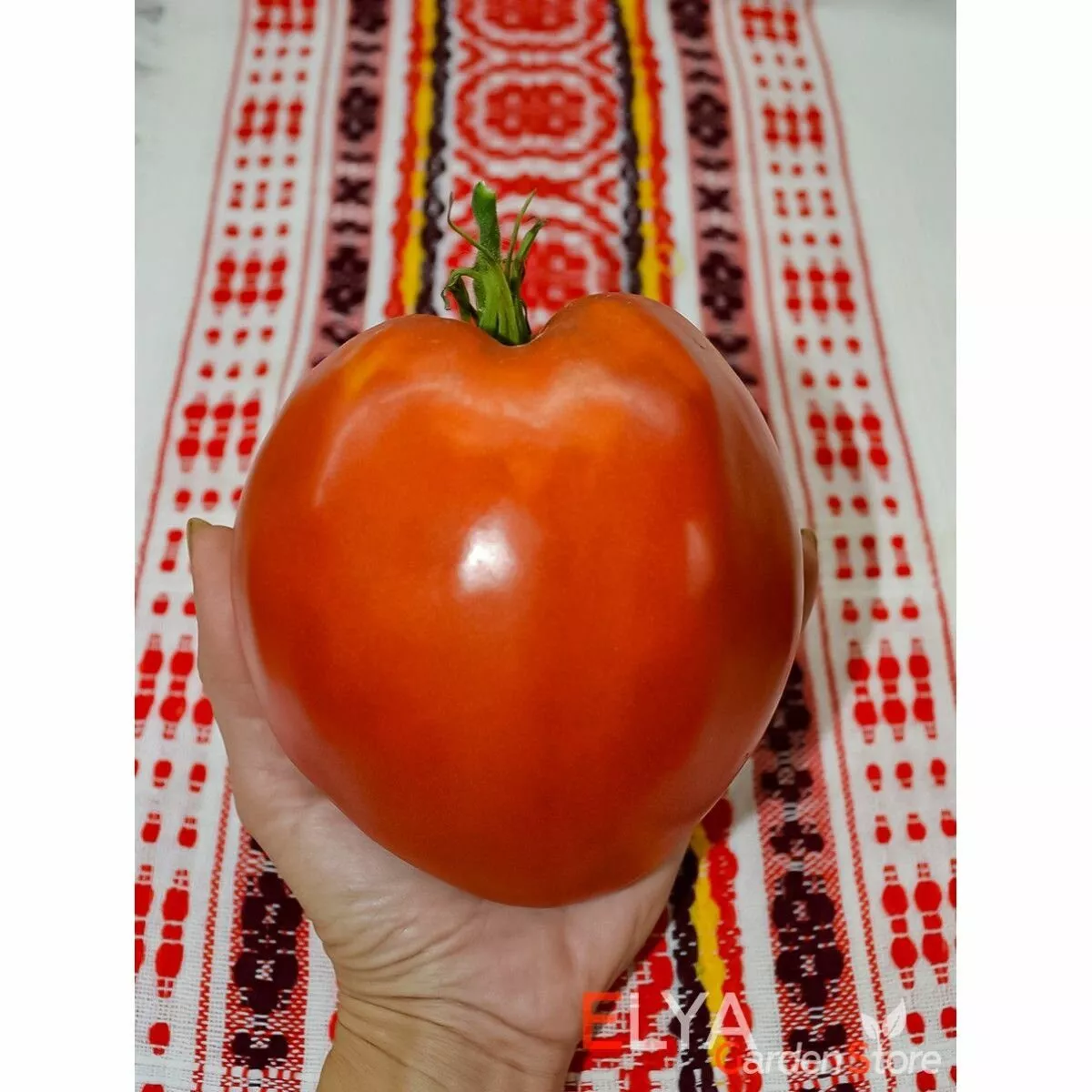 Окрашивание происходит равномерно, без зеленого пятна у плодоножки в стадии полной зрелости. Цвет кожицы и мякоти — насыщенно-красный. Плоды отличаются выдающейся массой: стандартный вес составляет 350-500 граммов, но на нижних кистях нередко завязываются гиганты массой 800-1000 граммов.