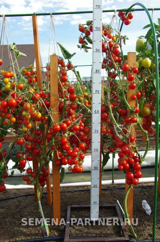 Компактный, но мощный куст с обильными кистями небольших, идеально ровных плодов — вот характерный портрет этого гибрида, который легко узнаваем на грядке или в теплице.