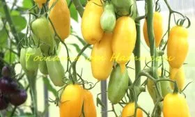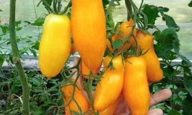 Плоды являются абсолютной визитной карточкой сорта. Их форма описывается как перцевидная или пальчиковая: они сильно удлиненные, с выраженным острым «носиком» на конце. Часто плоды имеют живописный изгиб или склонены в сторону, что придает кисти особый декоративный вид. Такая форма не случайна — она идеально подходит для их основного кулинарного назначения: вяления, сушки и цельноплодного консервирования, так как плотная мякоть с малым количеством семян и сока отлично сохраняет структуру.