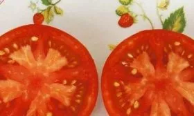 Мякоть отличается высокой плотностью и мясистостью (так называемый тип «биф-томата»), при этом оставаясь сочной. Семенные камеры развиты слабо, семян мало. Именно такая структура, наряду с прочной кожицей, обеспечивает устойчивость к растрескиванию, что подтверждается на практике даже при неравномерном поливе.