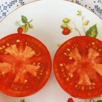 Мякоть отличается высокой плотностью и мясистостью (так называемый тип «биф-томата»), при этом оставаясь сочной. Семенные камеры развиты слабо, семян мало. Именно такая структура, наряду с прочной кожицей, обеспечивает устойчивость к растрескиванию, что подтверждается на практике даже при неравномерном поливе.