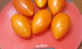 Плоды формируются в простых кистях. Их главная отличительная черта — стабильный, выровненный размер и форма. Каждый помидор имеет массу 50-60 граммов и характерную цилиндрическую форму, часто с легким заострением («носиком») на конце.