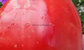В состоянии полной биологической зрелости плоды приобретают равномерный розовый цвет с малиновым подтоном, без зеленого пятна у плодоножки. Масса томатов варьируется в широких пределах: от 500-600 граммов при стандартном формировании куста до 800-1500 граммов при нормировании количества завязей. Для получения таких гигантов на кисти оставляют не более 2-3 цветков.