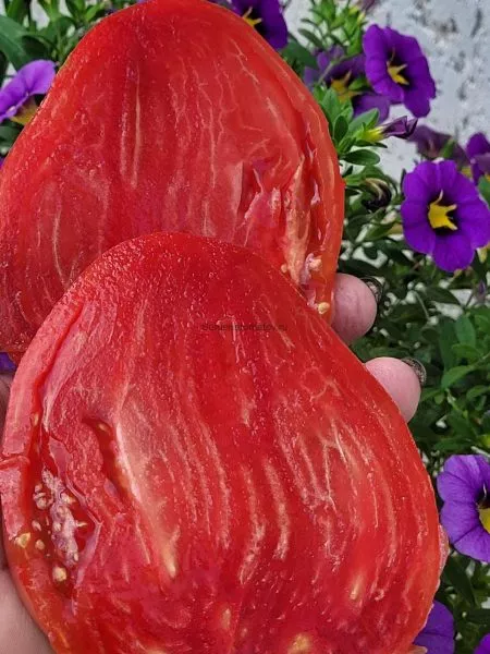 Главная отличительная черта сорта — это плоды. Их форма чаще всего описывается как сердцевидная или плоскоокруглая, но ключевой особенностью является глубокая, выраженная ребристость в области плодоножки. Эта ребристость не сглаживается по мере созревания, придавая томатам фактурный, «королевский» вид. Мякоть очень плотная, многокамерная, с высоким содержанием сухих веществ, что является типичным признаком сортов, предназначенных для переработки на пасту и сок.