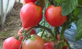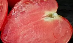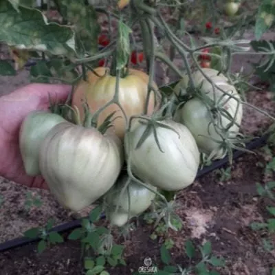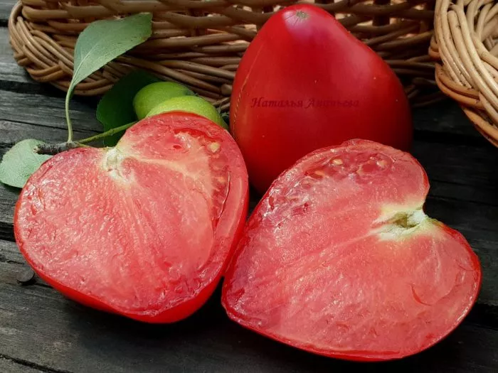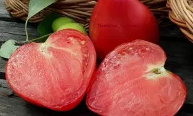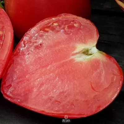 Кожица плотная, но не грубая, что предохраняет плоды от растрескивания при соблюдении режима полива. Мякоть многокамерная, мясистая, сочная, с небольшим количеством семян. Визуально сорт легко отличить по сочетанию высокой лозы и нарядных кистей с малиновыми «сердцами» разного калибра.