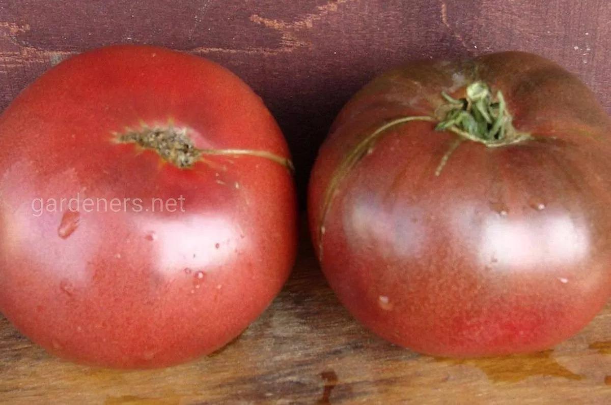Окрашивание происходит в несколько этапов. В стадии технической спелости плод темно-зеленый с характерным темно-фиолетовым или почти черным антоциановым пятном у основания. По мере созревания это пятно постепенно «расплывается», а основной цвет меняется на насыщенный темно-розовый. Окончательно созревшие томаты приобретают сложный окрас: темно-малиновый или свекольный основной тон с шоколадно-фиолетовыми плечиками. Интенсивность этого фиолетового отлива напрямую зависит от количества получаемого ультрафиолета.