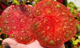 Мякоть при полном биологическом созревании становится насыщенно-красной, очень мясистой и плотной, с небольшими семенными камерами. Кожица тонкая, но достаточно прочная, чтобы удерживать содержимое крупного плода. Однако при резких перепадах влажности почвы на ней могут появляться трещины.
