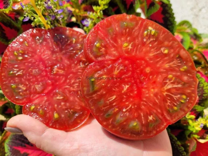 Мякоть при полном биологическом созревании становится насыщенно-красной, очень мясистой и плотной, с небольшими семенными камерами. Кожица тонкая, но достаточно прочная, чтобы удерживать содержимое крупного плода. Однако при резких перепадах влажности почвы на ней могут появляться трещины.