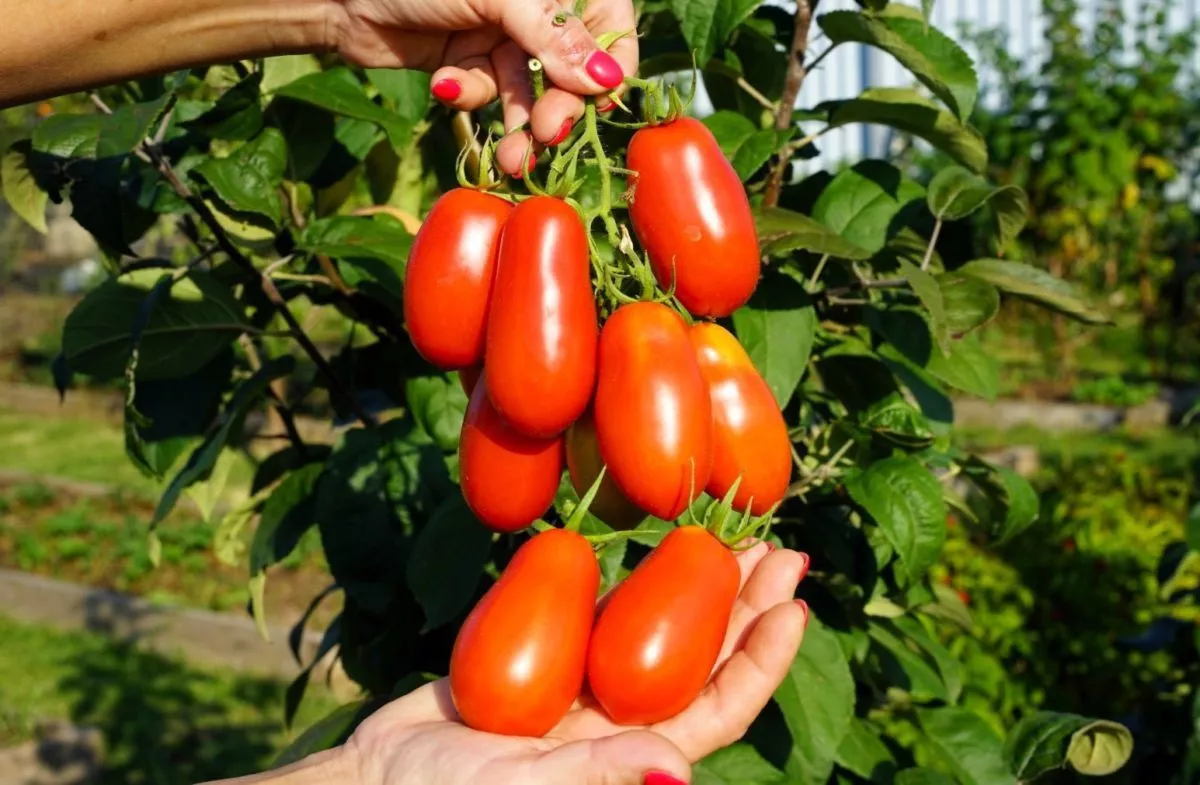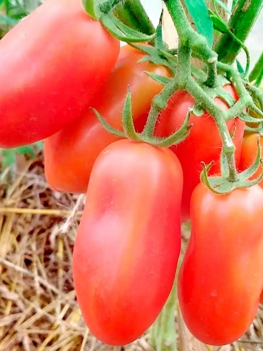 Плоды являются ключевой отличительной чертой сорта. Их форма — удлиненный цилиндр с характерным небольшим носиком на вершине — относится к типу «сливка» или «пальчиковая». Такая конфигурация не только придает узнаваемый внешний вид, но и имеет практическое значение: плотная мякоть и малое количество семенных камер делают эти томаты идеальными для цельноплодного консервирования, вяления и сушки.