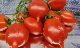 Плоды имеют классическую округлую форму, но с характерным, ярко выраженным носиком на вершине. Эта деталь делает их легко узнаваемыми среди других сортов черри и коктейльного типа. Средняя масса, согласно характеристикам, составляет от 25 до 50 граммов, что попадает в категорию мелкоплодных томатов.