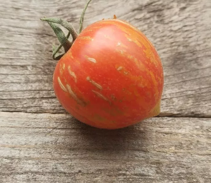 Главная «изюминка» — это окраска. Зрелый томат обладает насыщенным красным основным цветом, по которому проходят контрастные золотисто-желтые штрихи и полосы. Эта пестрая расцветка является надежным индикатором полной спелости. Яркое проявление полосатого рисунка сигнализирует о том, что плод набрал максимум сахара и аромата.