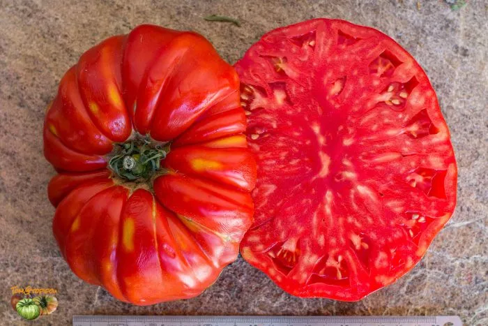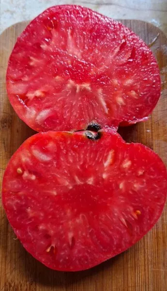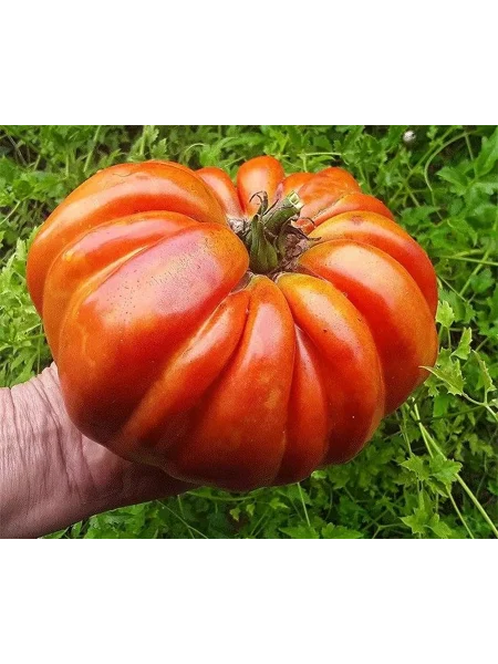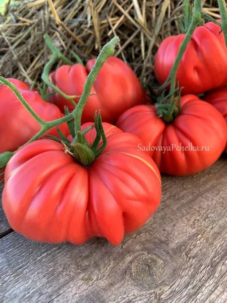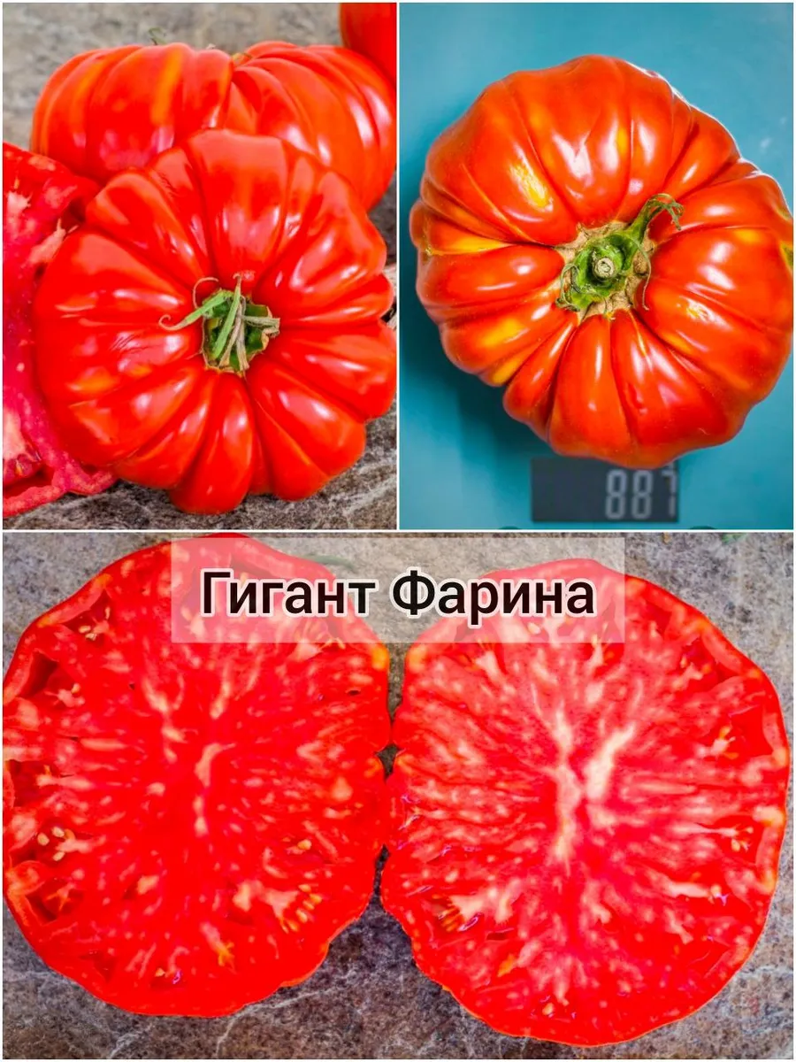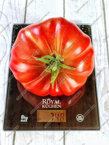 В фазе технической спелости окраска меняется на равномерный, насыщенный красный цвет. Плоды многокамерные, с большим количеством семенных камер и сока. Из-за рекордной массы, которая у отдельных плодов может достигать 1.5-2 кг, они часто деформируются, приобретая причудливые очертания. Такая деформация под собственным весом — обычное явление для томатов-гигантов и не считается признаком заболевания или нехватки питания.